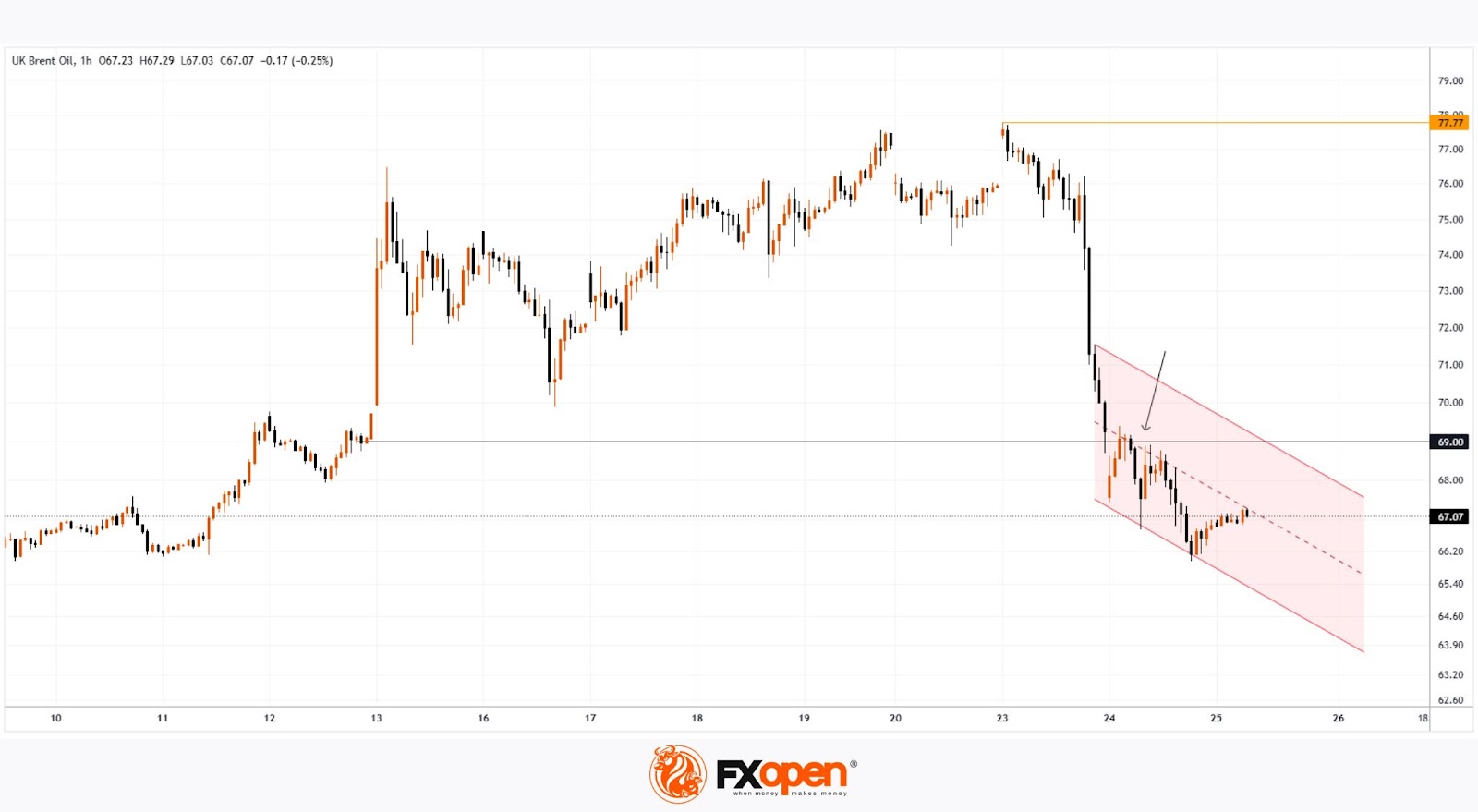 It can be assumed that the longer the ceasefire holds, the less relevant the fears that have served as bullish drivers. In that case, Brent crude prices may continue fluctuating within a downward channel, outlined in red, with the possibility of a short-term rise toward its upper boundary.