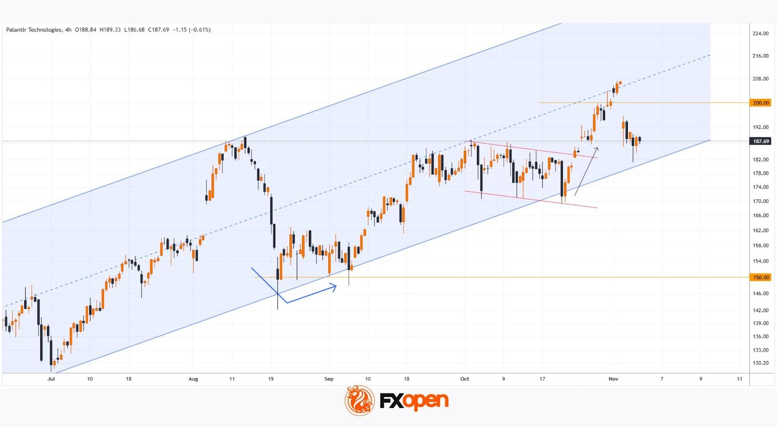 → confirmed the relevance of the ascending channel (shown in blue) and highlighted support around the psychological level of $150;