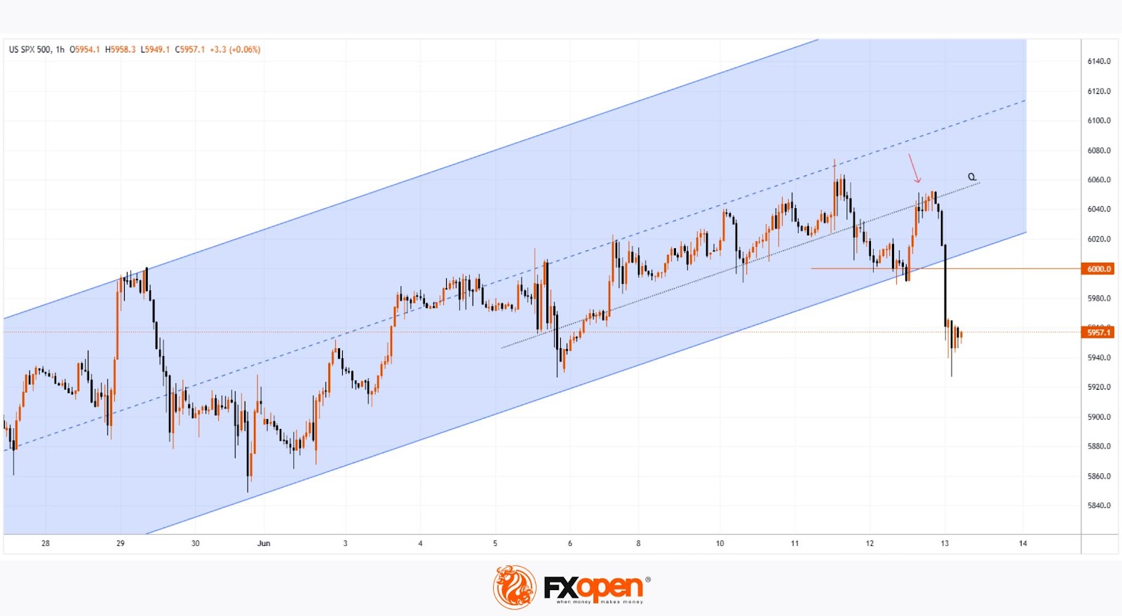 Selling pressure intensified, and the psychologically important 6,000 level — which showed signs of support earlier in June — now appears to be acting as resistance. It is in this area that the E-Mini S&P 500 (US SPX 500 mini on FXOpen) broke below the lower boundary of its uptrend channel.