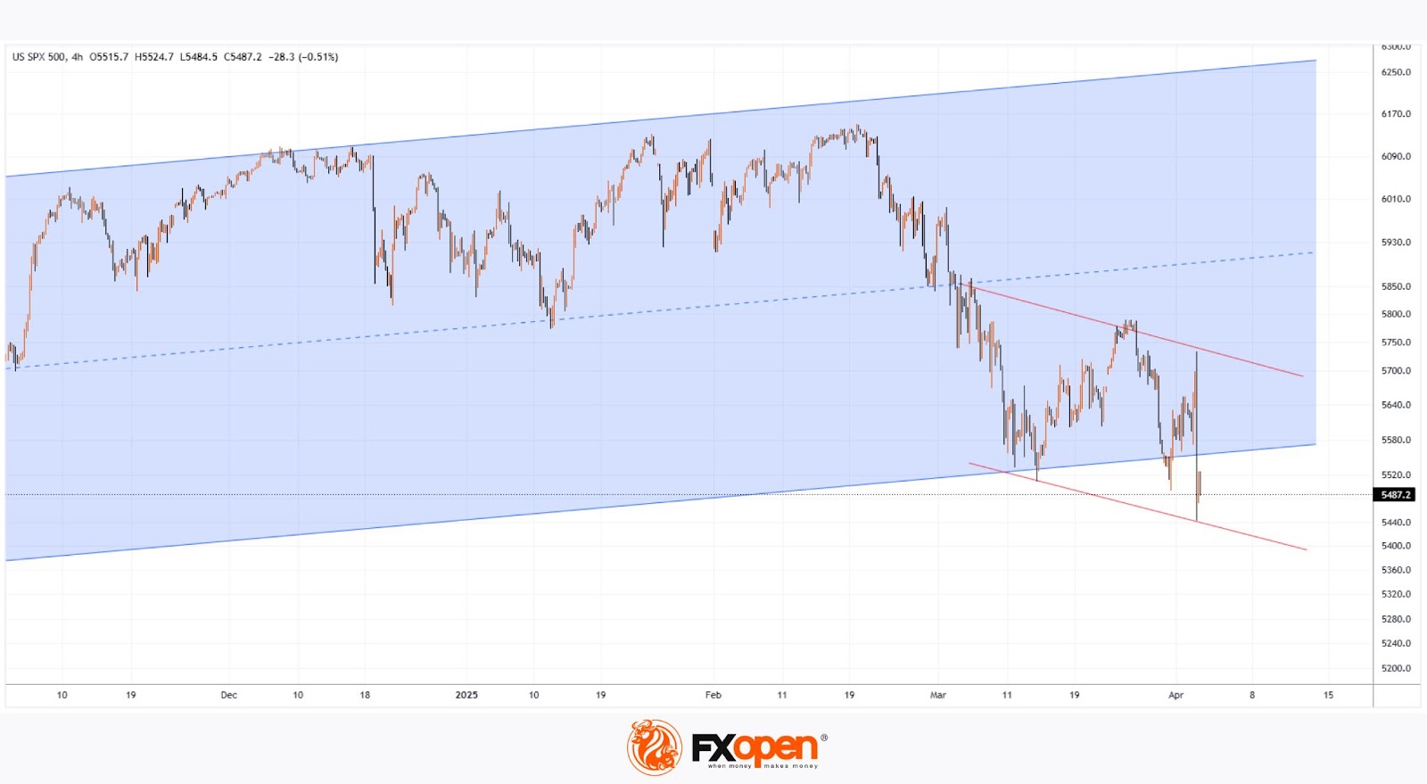 As shown on the S&P 500 Index (US SPX 500 mini on FXOpen) chart, the benchmark US stock index dropped below 5,450 points for the first time in 2025. This decline reflects the US stock market’s reaction to the tariffs imposed by the White House on international trade.