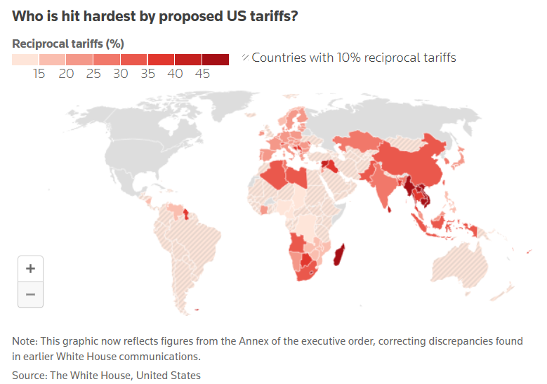 → President Donald Trump announced a 10% tariff on most goods imported into the United States, with Asian countries being hit the hardest.