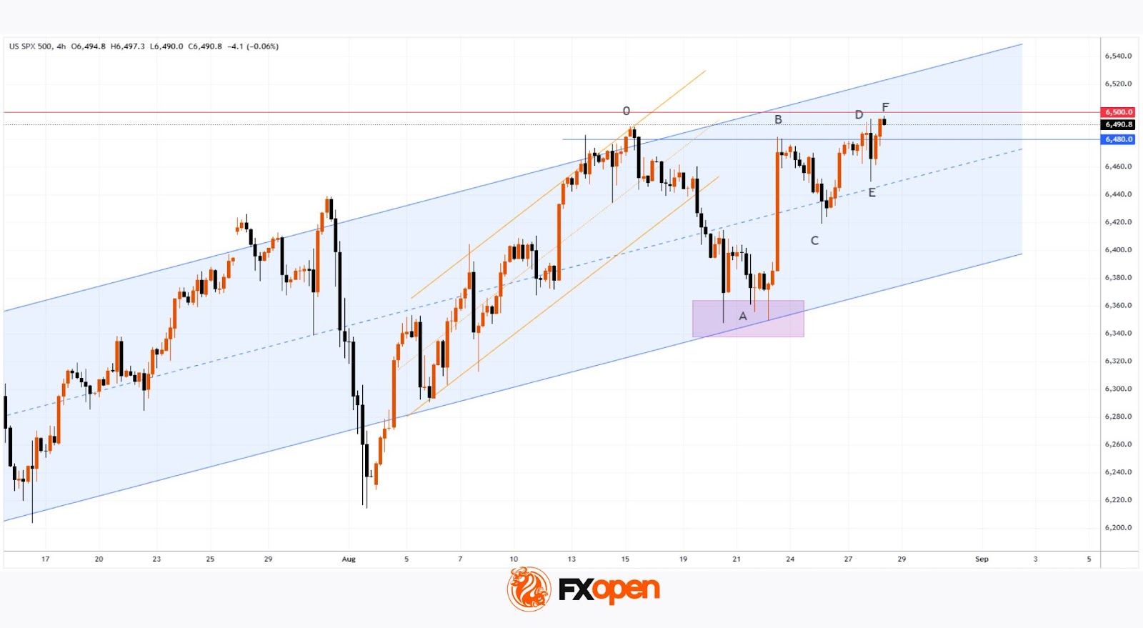 Looking at the 4-hour chart of the S&P 500 (US SPX 500 mini on FXOpen), there are grounds to make slight adjustments to the slope and width of the ascending channel to better reflect the latest data.