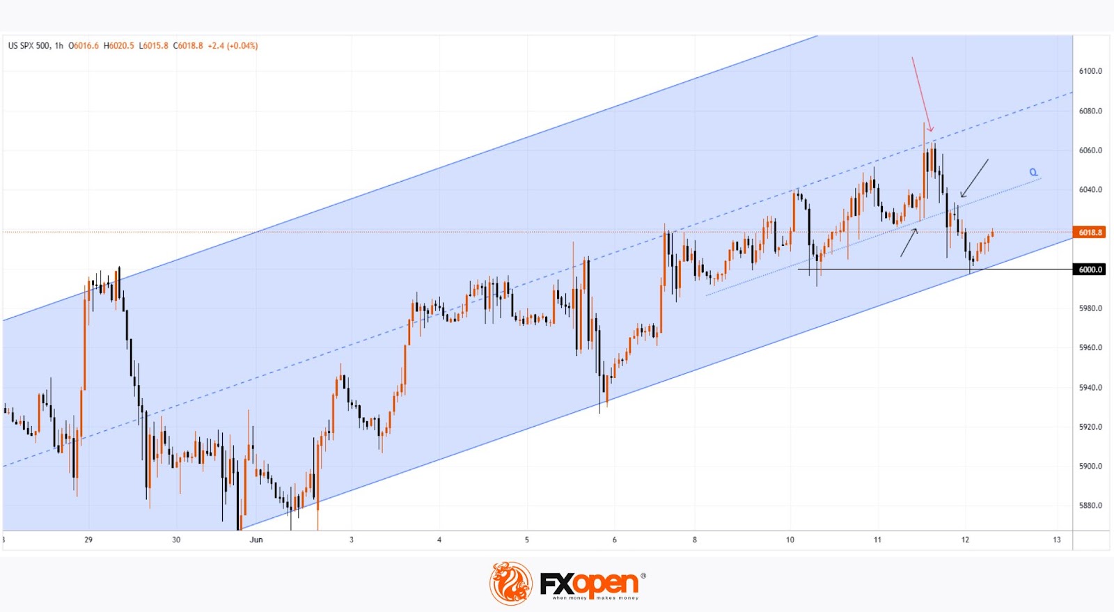 As the chart of the S&P 500 (US SPX 500 mini on FXOpen) shows, price movements in June continue to form an upward trend (highlighted in blue).