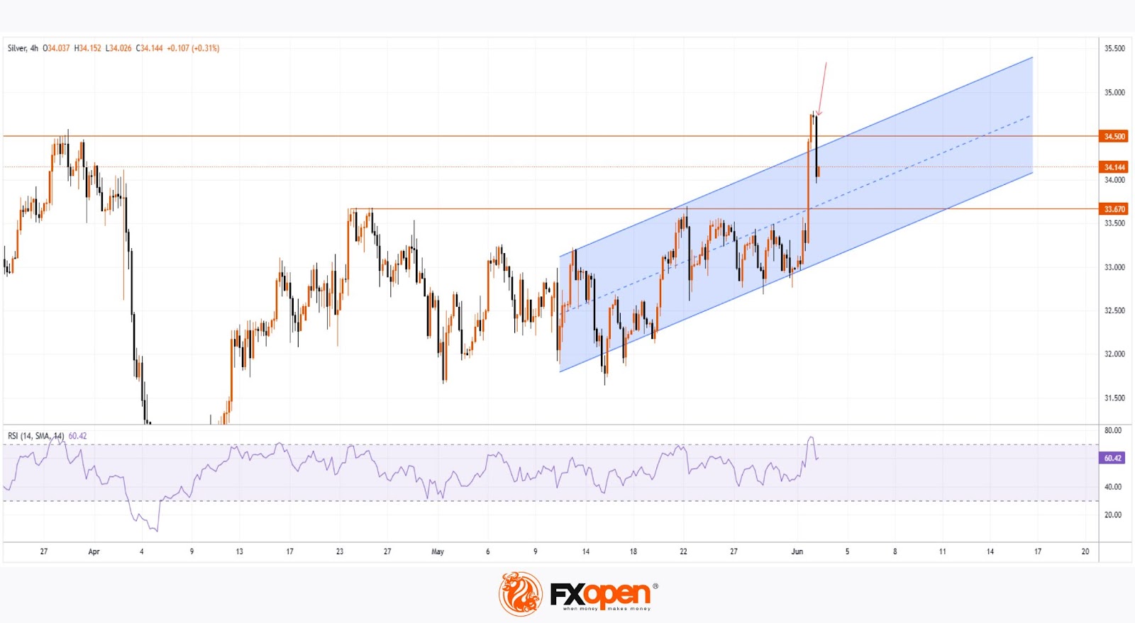 As shown on the XAG/USD chart, silver prices rose on Monday, surpassing the previous high of the year, which was set on 28th March at around $33.50 per ounce.