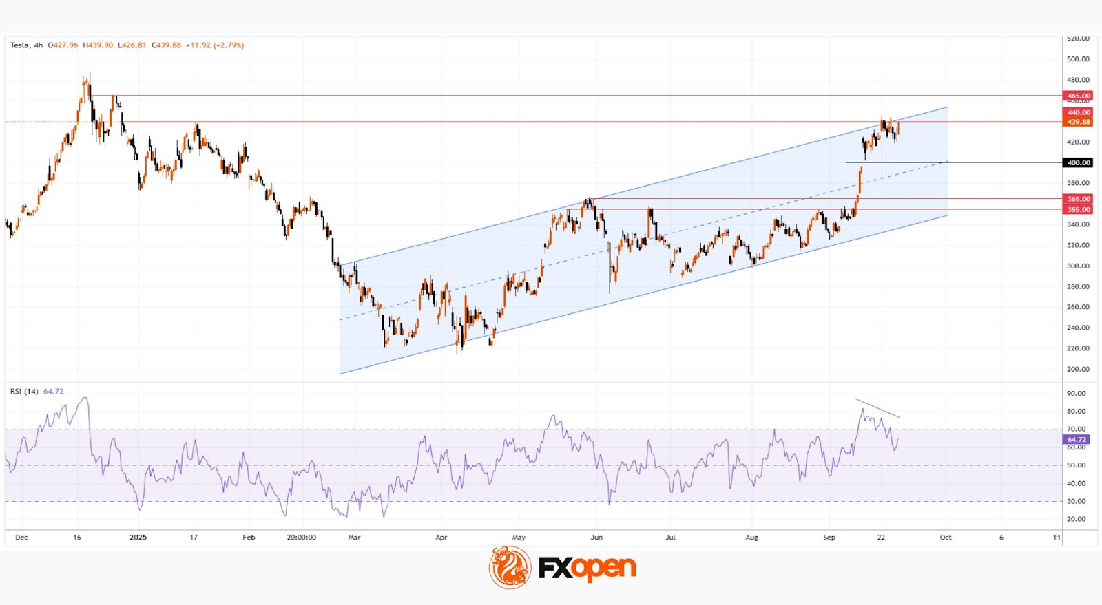 By analogy, the $445–465 zone may also act as resistance — meaning a correction remains a plausible scenario. For example, TSLA stock price could pull back to test the psychological $400 level, which is supported by the median of the current channel.
