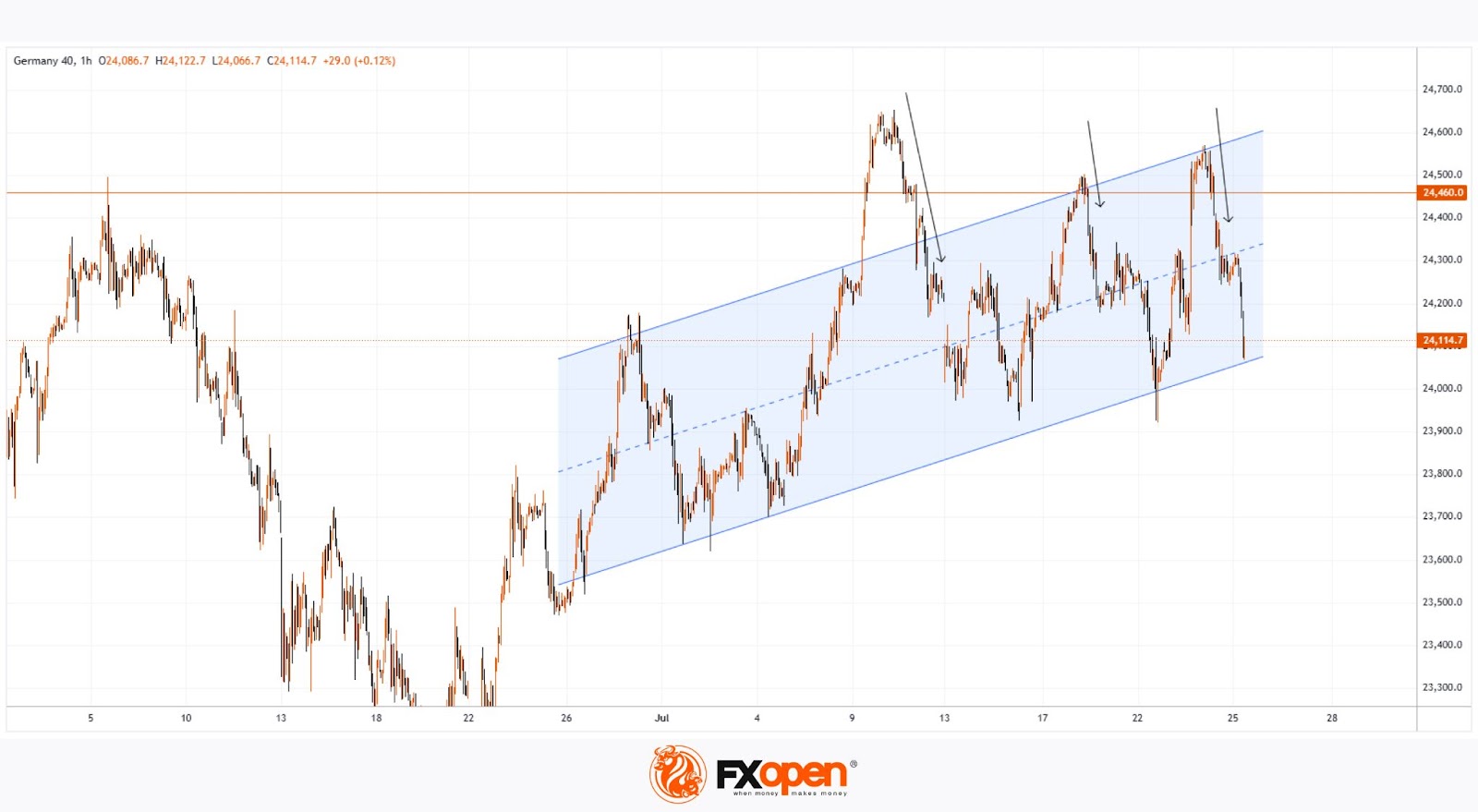 From a technical analysis perspective, the DAX 40 (Germany 40 mini on FXOpen) formed an ascending channel in July (outlined in blue). However, each time the bulls attempted to push the price above the 24,460 level (which corresponds to the May high), they encountered resistance.