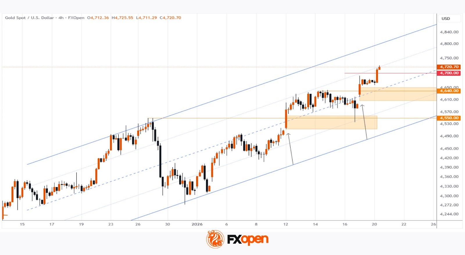 Today, 20 January, the market continues to show extremely bullish sentiment — for the first time ever, the price of gold has climbed to $4,720.