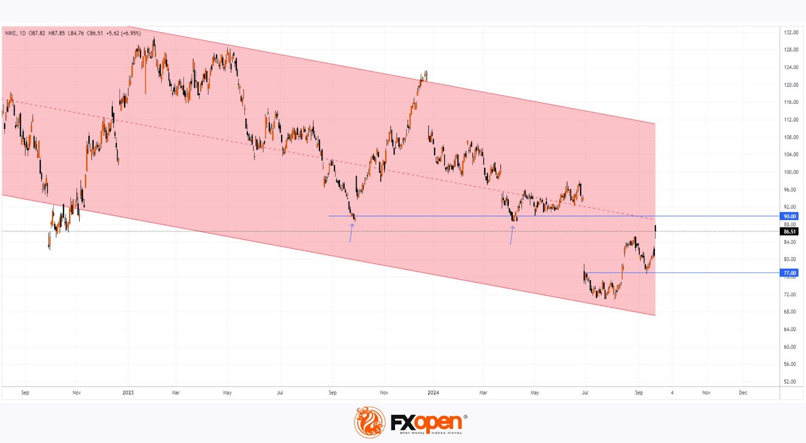 On the other hand, the bulls have their argument: the $77.00 level provided support during the test on 11 September. The significance of this level lies in the fact that it originates from the 28 June candlestick, when, according to NASDAQ data, an abnormally high volume of 130 million shares was traded. It’s possible that professional traders were the buyers, believing the share price of the well-known brand had become attractive.