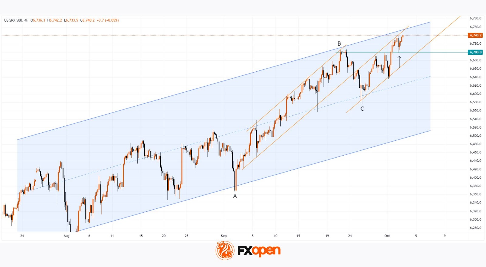 Today, the S&P 500 index (US SPX 500 mini on FXOpen) reached a fresh all‑time high: on Friday morning the price rose above 6 740 points. This confirms the continued optimism among market participants. Today this is supported by news related to the creators of ChatGPT.