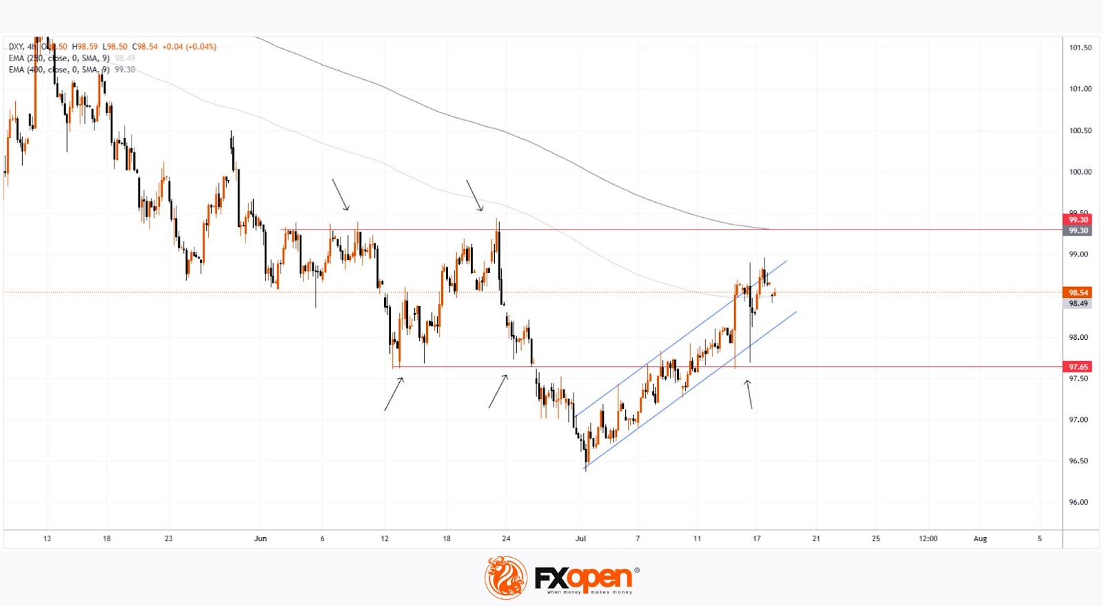 However, the picture shifted in July: the index began rising steadily (already up approximately +1.9% since the beginning of the month), highlighted by the blue ascending trend channel.