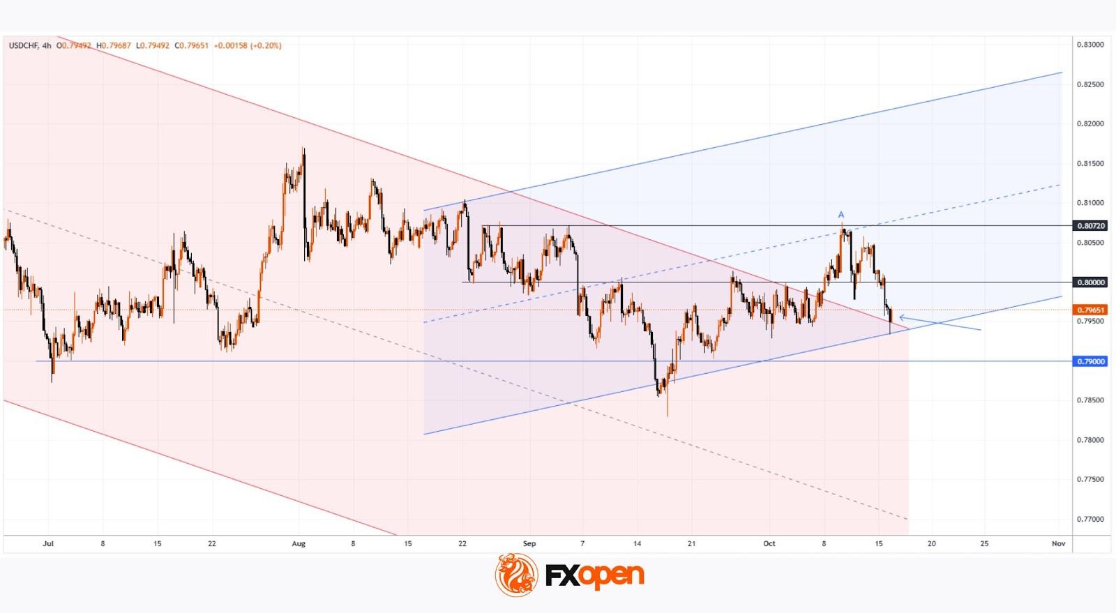 The arrow highlights signs of a bullish engulfing pattern, suggesting that buyers may be using these support zones to stage a rebound within the blue channel. The 0.8000 psychological mark could serve as the first key test of their resolve.