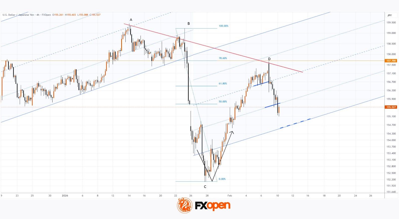 → lower highs A–B–D have formed on the USD/JPY chart, with a bearish trend line drawn through them.
