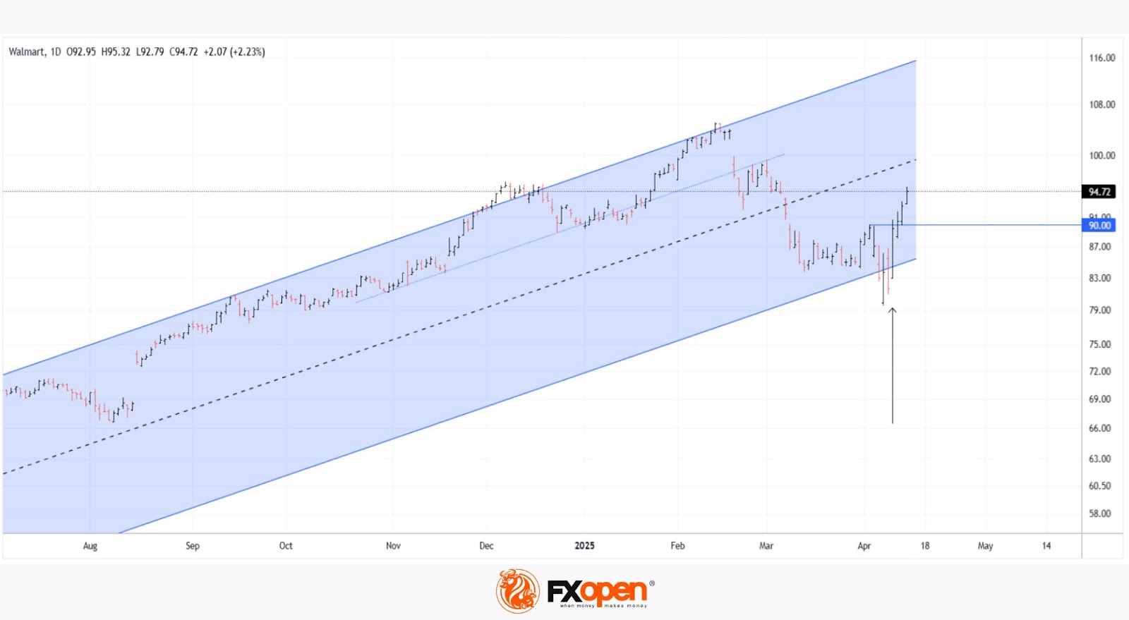 As shown on the chart of Walmart (WMT) shares, trading closed yesterday above the $94 mark – a level not seen since the beginning of March. This means that since the start of 2025, Walmart’s share price has risen by approximately 5.5%.