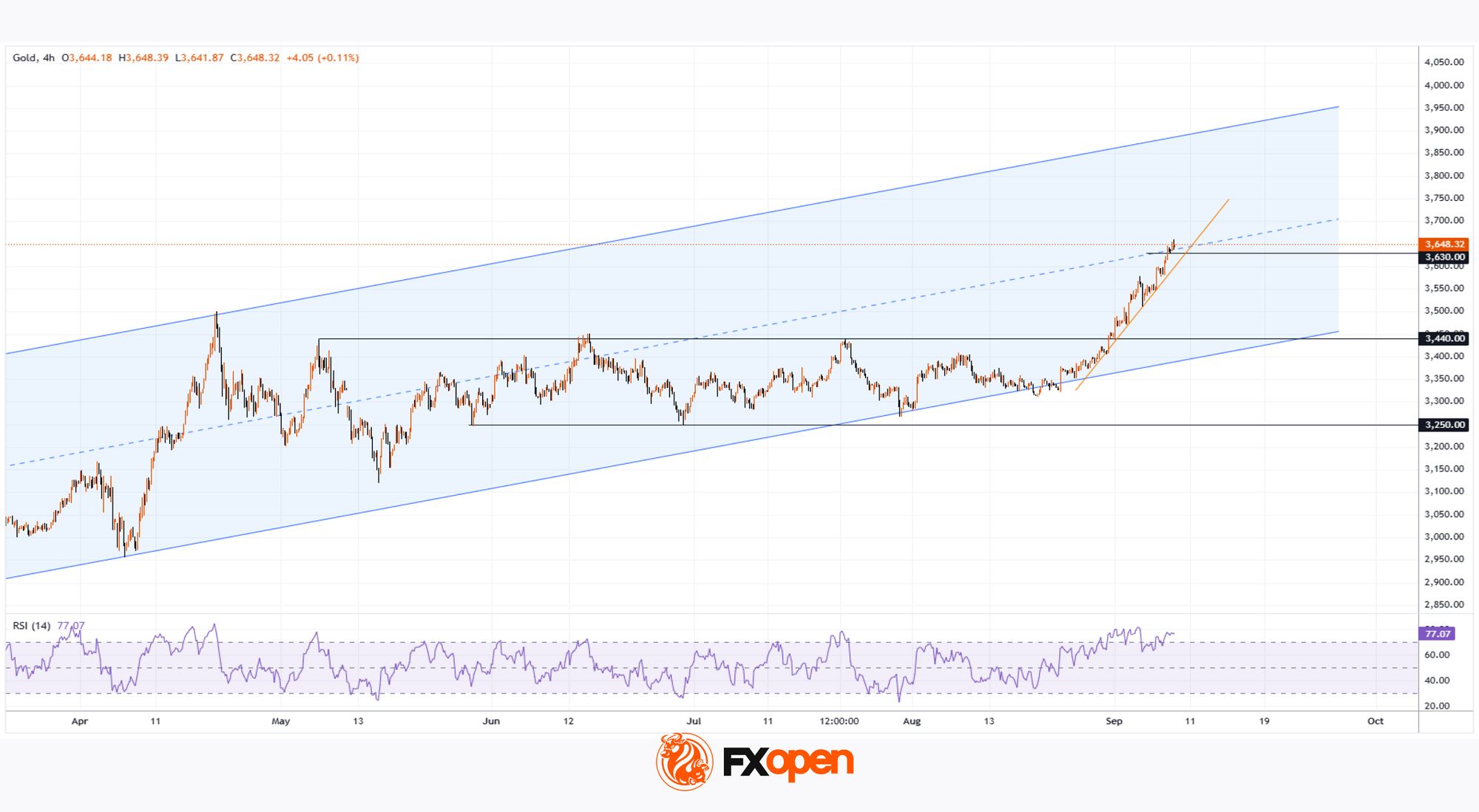 Today’s XAU/USD chart shows that gold continues to set records in September. The price has risen above $3,650 per ounce for the first time in history – one of the main drivers being expectations of a Federal Reserve rate cut on Wednesday, 17 September.