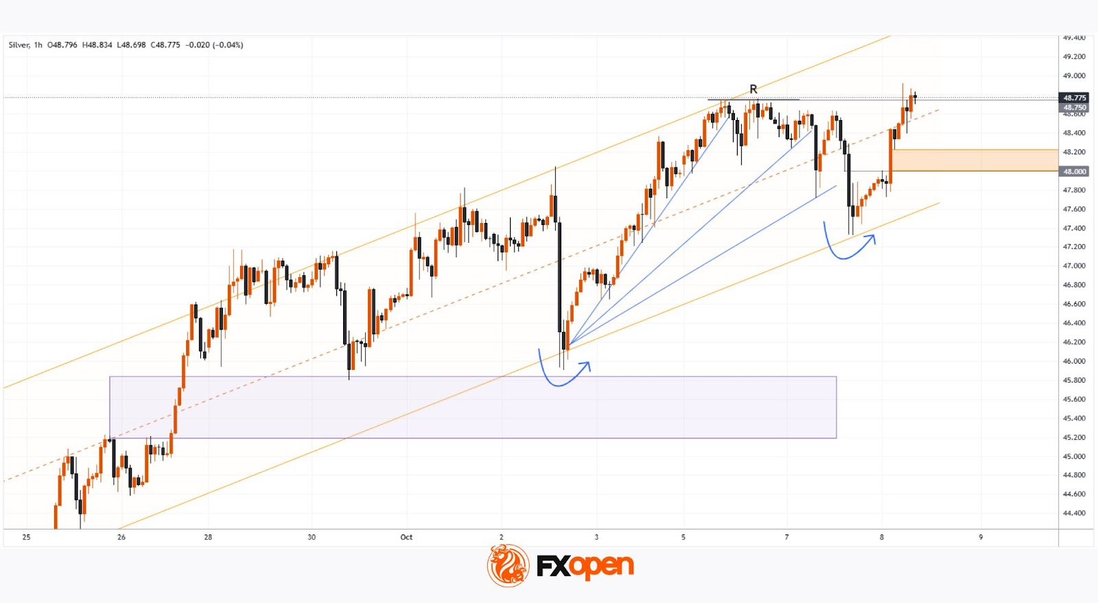 Indeed, this scenario played out, and the reversal from the identified support block (as shown by the first arrow) occurred with notable momentum. The upward trend then continued, with silver prices remaining within the orange channel, which is still relevant today.