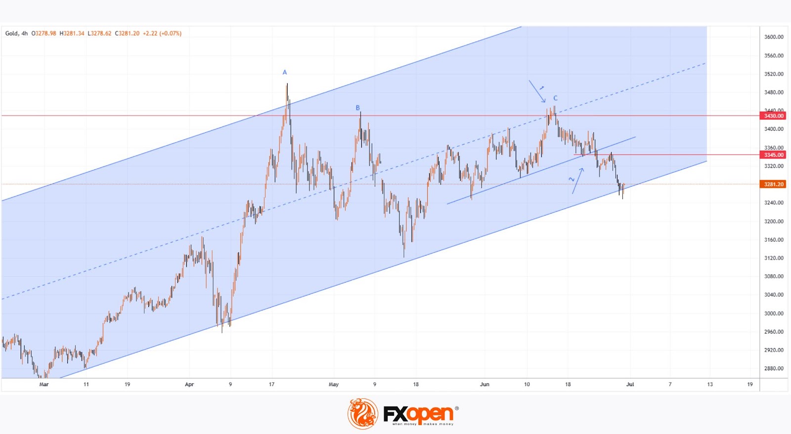 A rebound from the lower boundary is possible in early July, but how strong might it be? Note that bears have taken control of the $3,345 level (which has now flipped from support to resistance), and there are signs of a triple top pattern (A-B-C) forming near the $3,430 resistance. This raises the risk of a bearish breakout from the ascending channel.