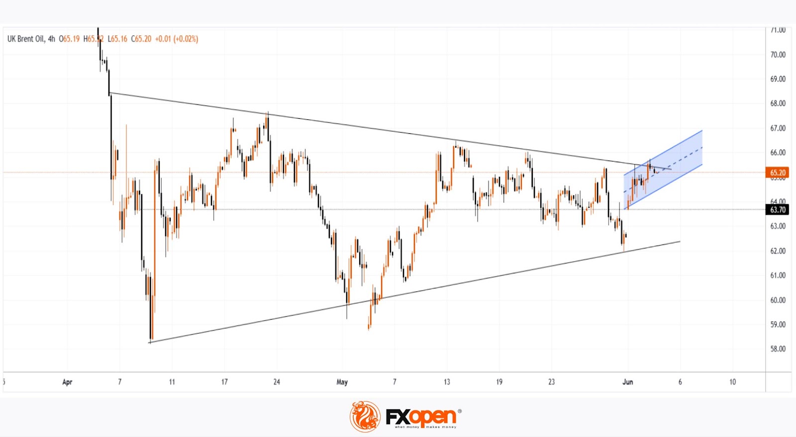 This resistance is defined by the upper boundary of a narrowing triangle, with its central axis around the $63.70 level — a price that could be considered a fair value based on trading over the past one and a half months.