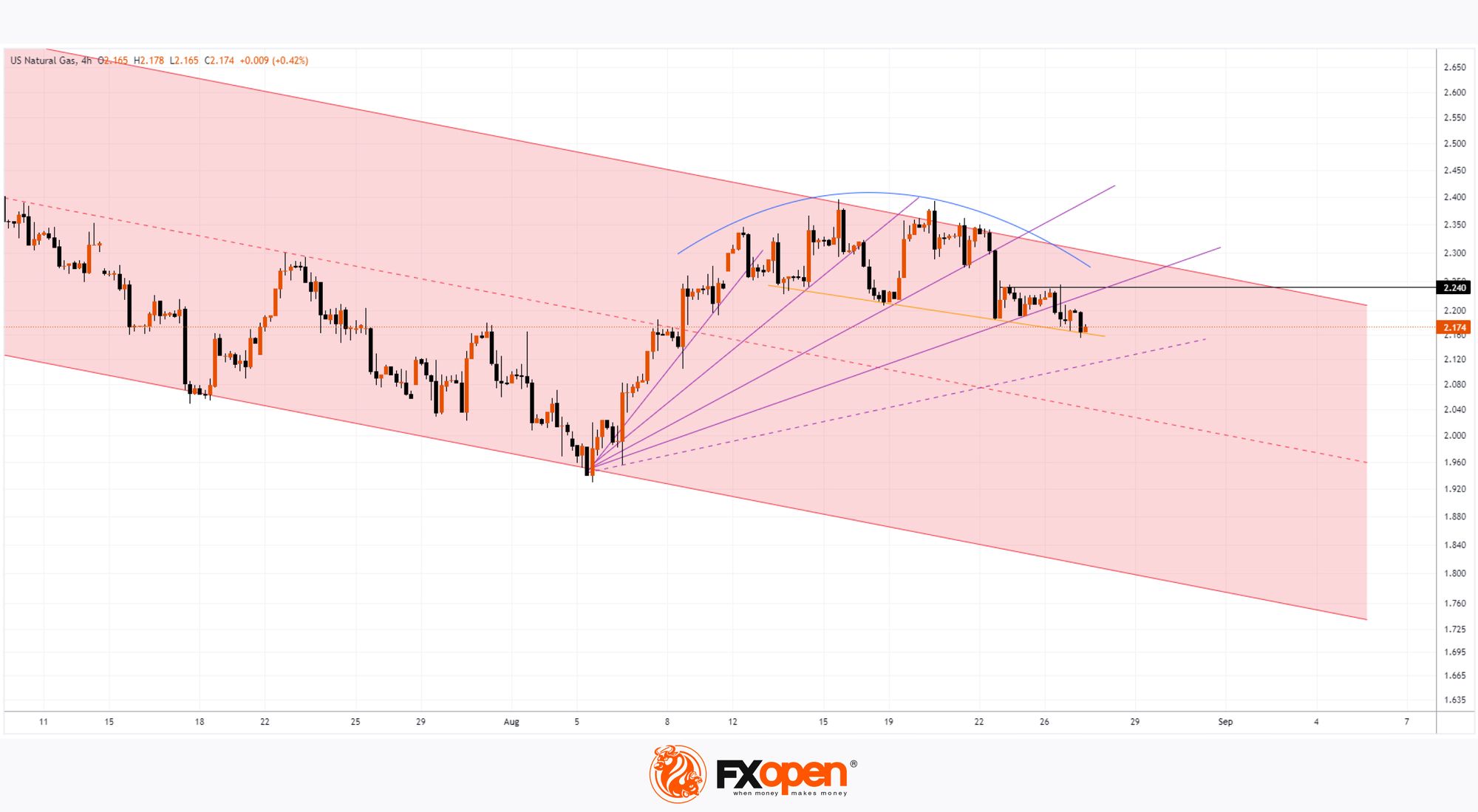 As shown on the XNG/USD chart, today, the price of natural gas fell below $2.16 for the first time since 8 August.