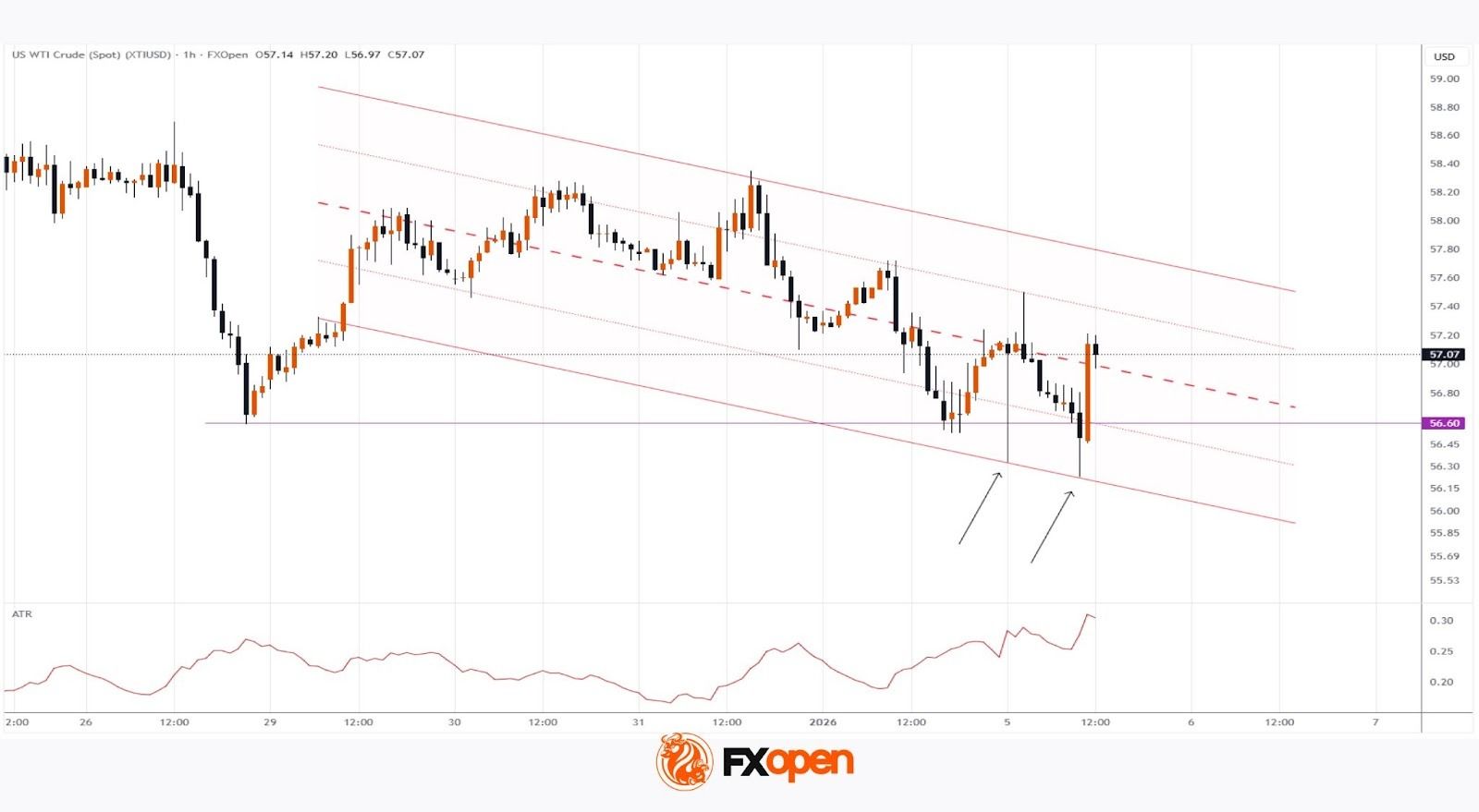 At present, WTI crude oil price is holding near the median of the descending channel (highlighted in red). Note the long lower wicks forming when the price touches the lower boundary of the channel, indicating a sharp activation of demand whenever the price falls below the 26 December low of around $56.60 per barrel.