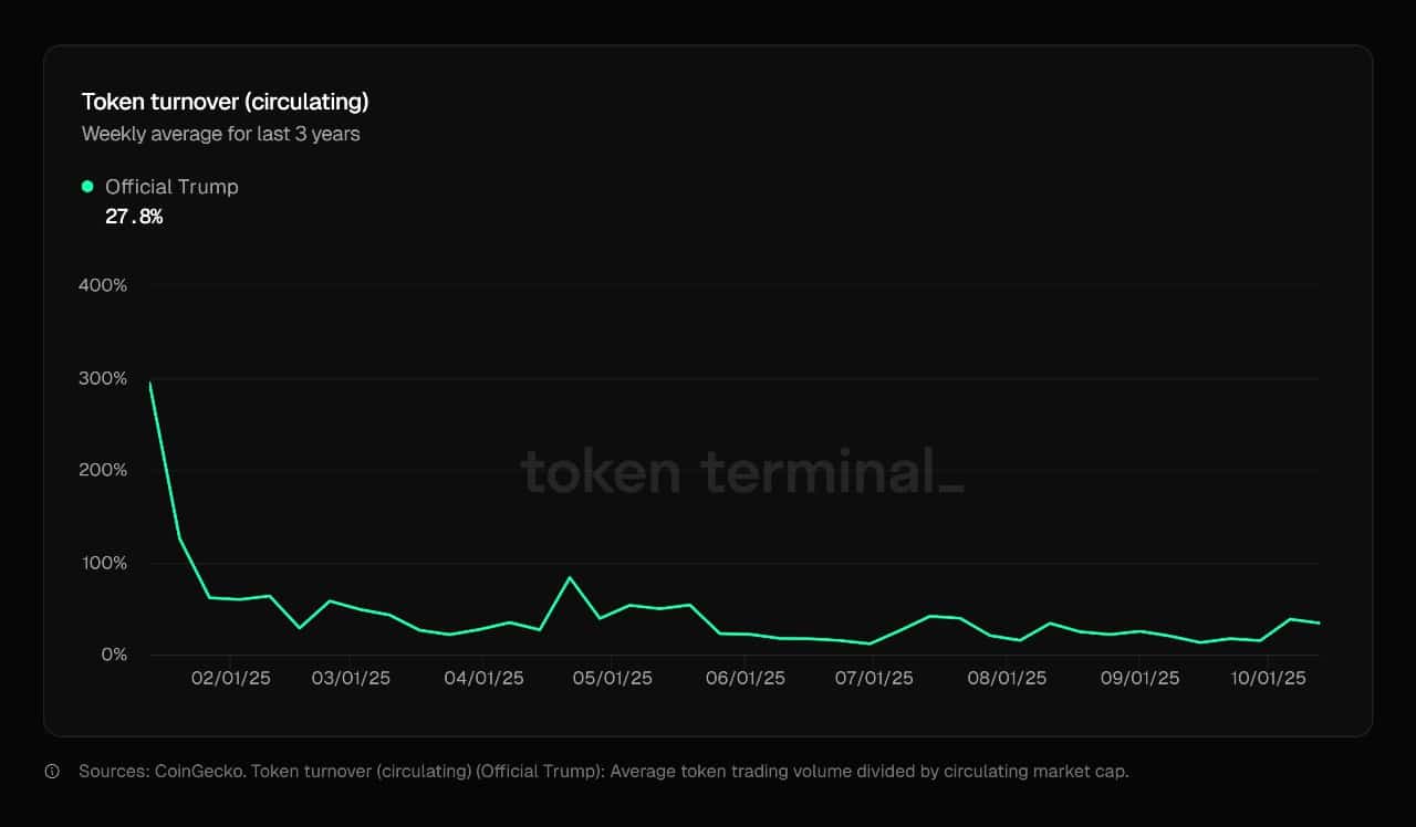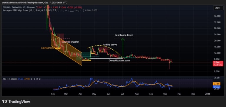 The daily TRUMPUSDT chart tells a cautious story. The coin broke out of a strong bearish channel in April, only to fall into a new “consolidation zone” near $8. The resistance level sits higher at $20, marked by several failed breakout attempts mid-year.