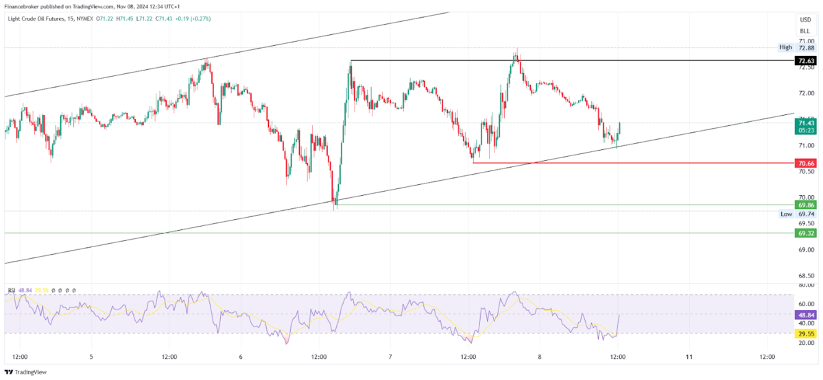 On the 7th November 2024 trading session, oil can be seen highly volatile on the 2nd consecutive trading session, where the price went down near the supporting trendline and sharply reversed, breaking the 6th Nov day high of 72.63. Currently, the price is moving upwards in an uptrend channel but with high volatility.