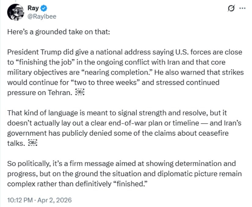 President Trump stated that U.S. forces are close to achieving key objectives in the Iran conflict and will continue strikes for weeks, signaling resolve but offering no clear endgame as the broader situation remains uncertain. Source: Ray via X