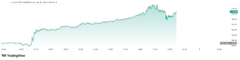 The WTI crude price recorded a dramatic move, jumping more than 10% in a single session to trade above $110 per barrel—its highest level in months. The rally, which began near the $98 range, reflects a sharp repricing of risk in the crude oil futures market.