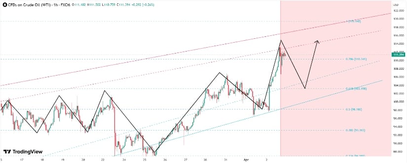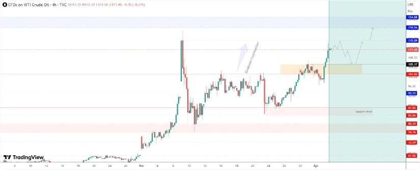 From a technical perspective, the oil price chart shows a clear breakout above the key $100 resistance level. This zone had previously acted as a psychological barrier, and the move above it signals strong bullish momentum.