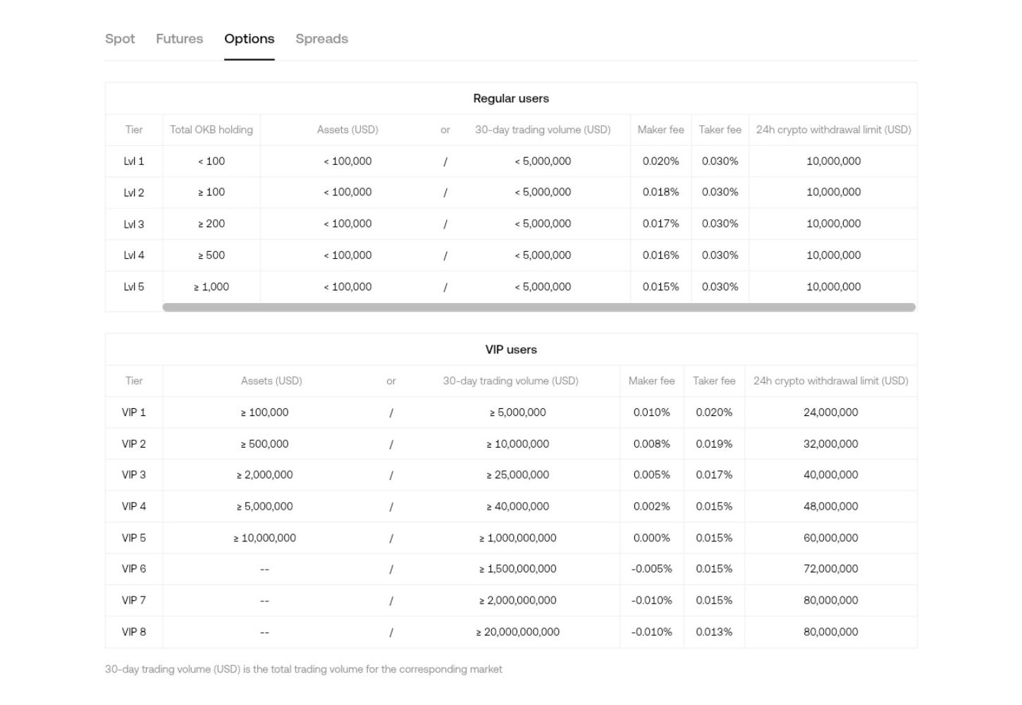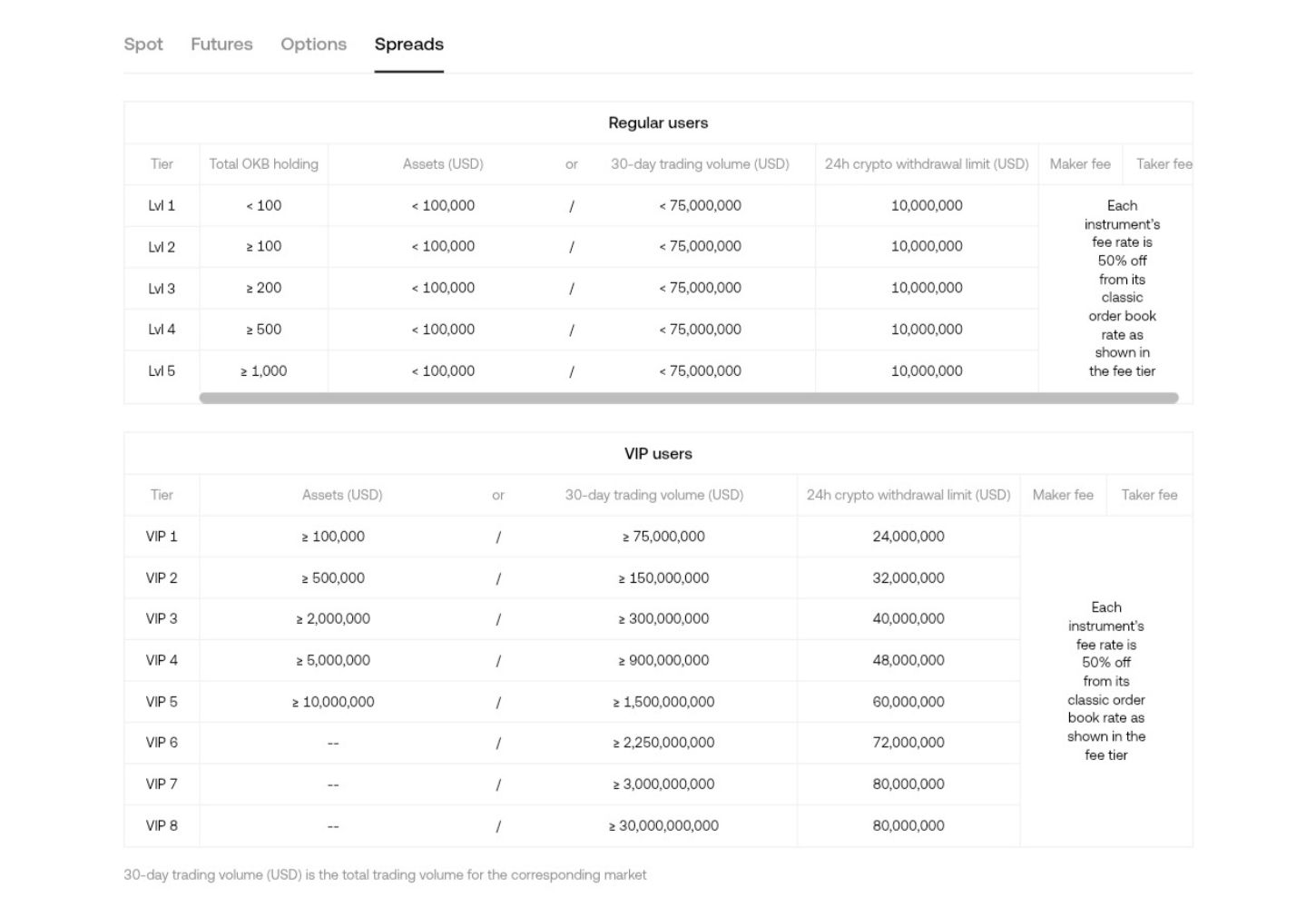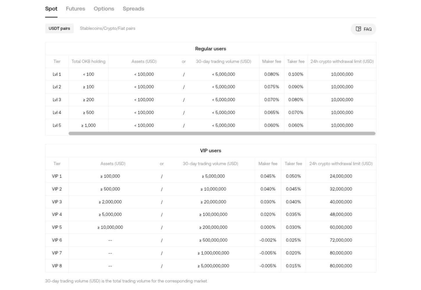 Note: The above fees are for USDT pairs. OKX charges less fees for crypto, other stablecoins, and fiat pairs depending on users’ 30-day trading volume.
