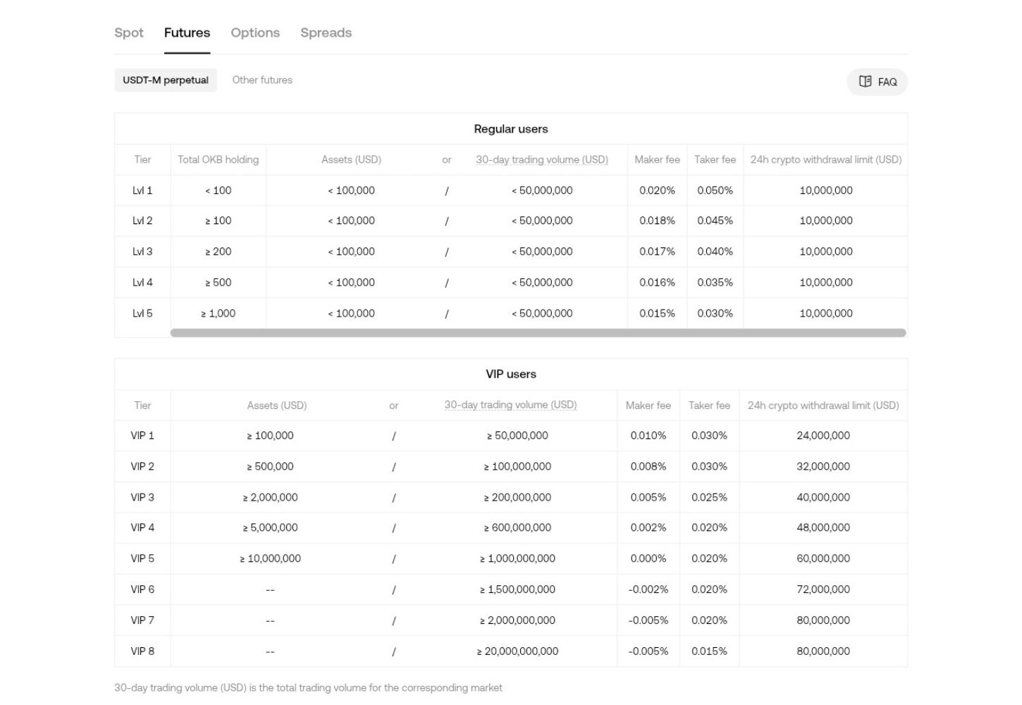 The fees are lower for VIP users, with VIP 1 users paying 0.03% (taker) and 0.01% (maker) for futures. The image below summarizes the fees for various VIP levels by trading volume or amount of OKB token the user is holding.