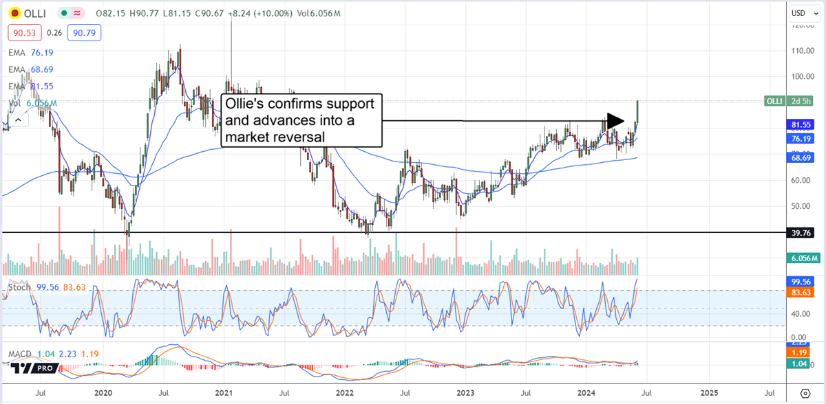 Ollie’s Bargain Outlet is up nearly 10% following the release and is likely to increase. The price action confirms support at a critical level and breaks to a new high to align with a market reversal. In this scenario, shares of Ollie’s could advance to $100 within a few weeks and exceed $110 by the end of the year.