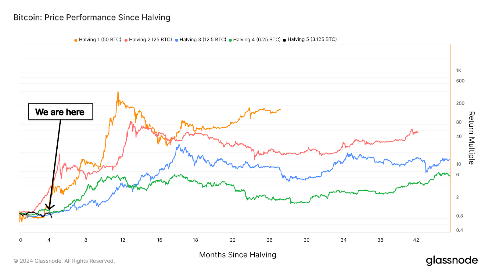 The Bitcoin halving is a crucial fundamental event. If we look at the return on investment in the two most recent cycles (marked in blue and green), we see that the first four months after the halving usually involve consolidation and volatility. During this period, prices dropped below their reading at the halving, which is similar to what we are experiencing now in 2024.