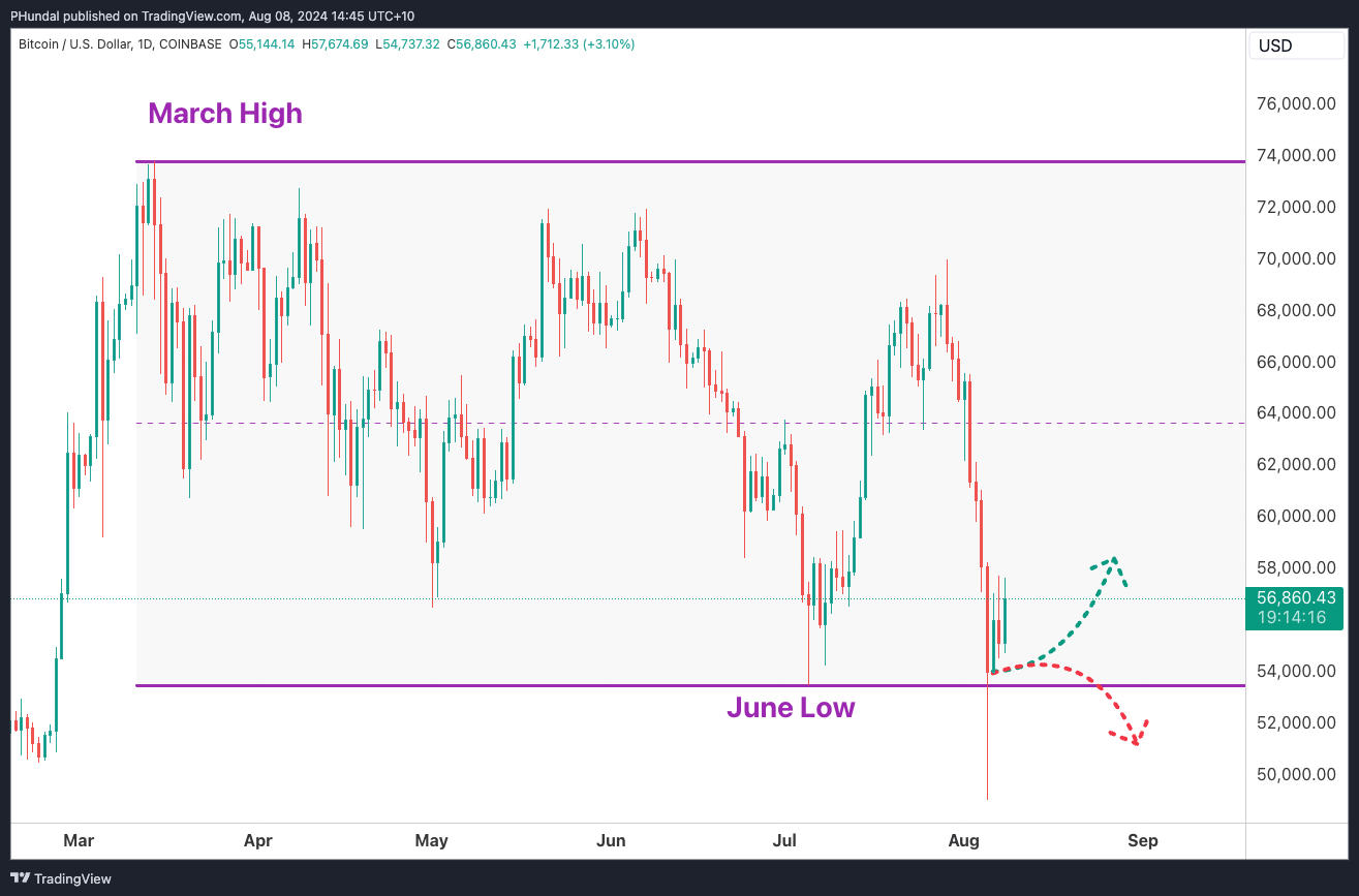 After making new monthly lows, the market has thus far regained the June low with haste. However, we could see these two potential scenarios next week. The fact we are still under the close of previous lows from June has me concerned that we may be down here for a while, until we can clear $59,000 USD.
