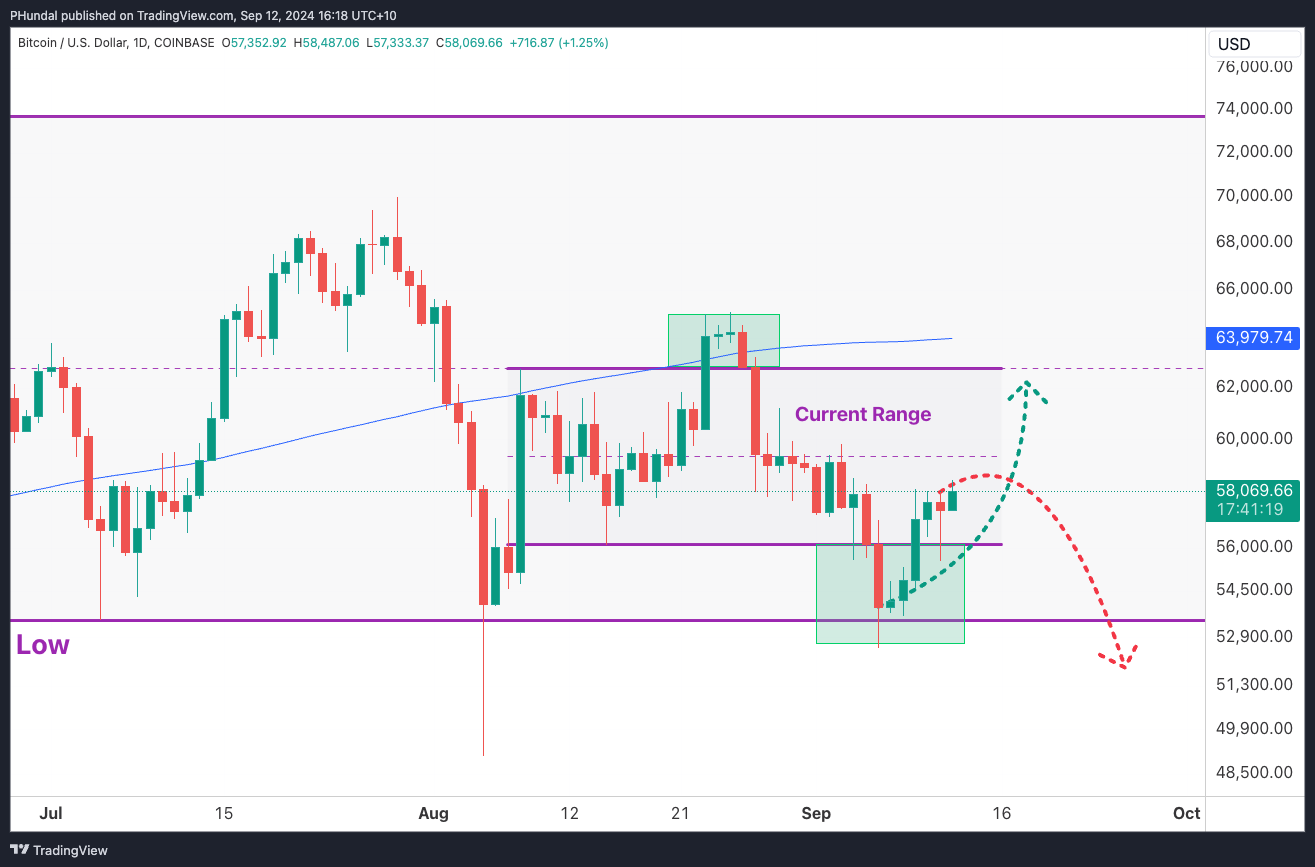 If bulls remain squeamish for the remainder of September, we could still see current momentum fade into the week, especially as prices move back towards previous highs and the middle of this current range at $59,000 USD.