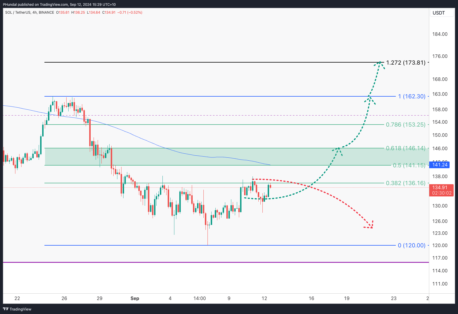 Solana is still in the early stages of showing trend reversal on the lower time frames. Zooming in we can start to build a framework using Fibonacci analysis and the 200 period moving average (blue line).