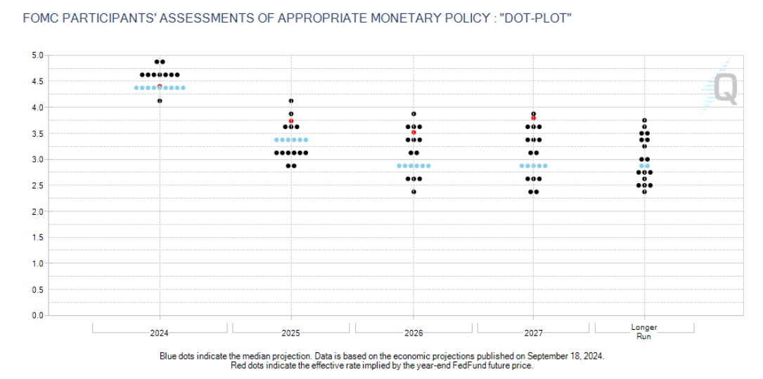 Without any unexpected events, median projections for 2024 suggest rates might drop to the 4.25% to 4.50% range across these two meetings by the end of next year.