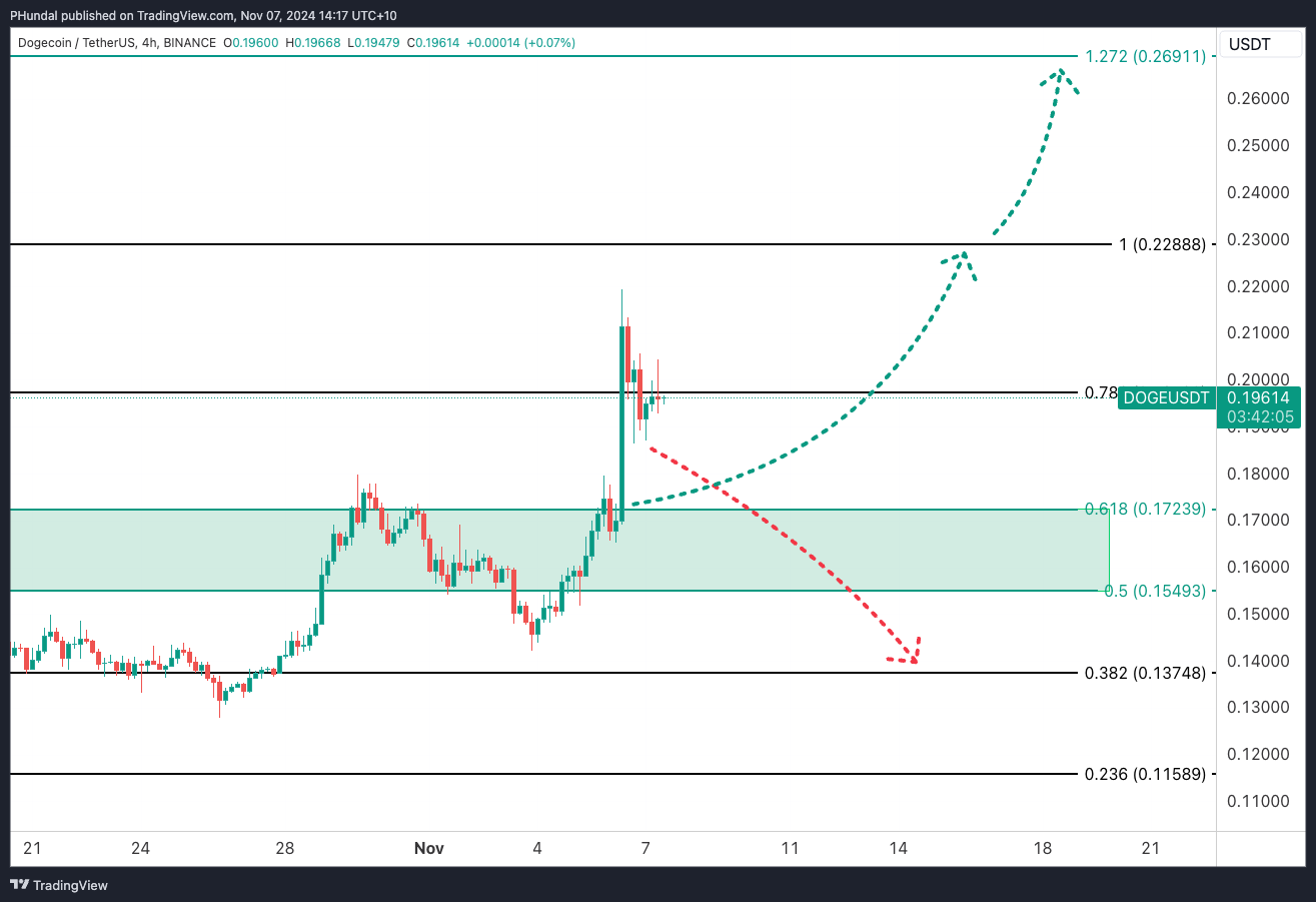 While we could see the market consolidate now we are at the 0.786 Fibonacci level, I would be watching dips get bought, and DOGE push towards the $0.22 previous high.