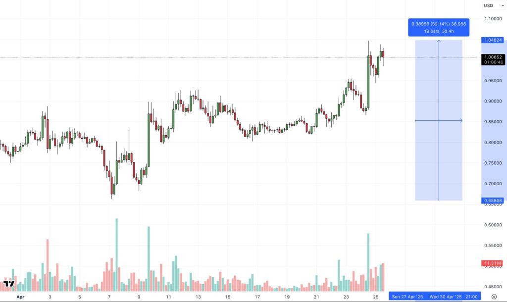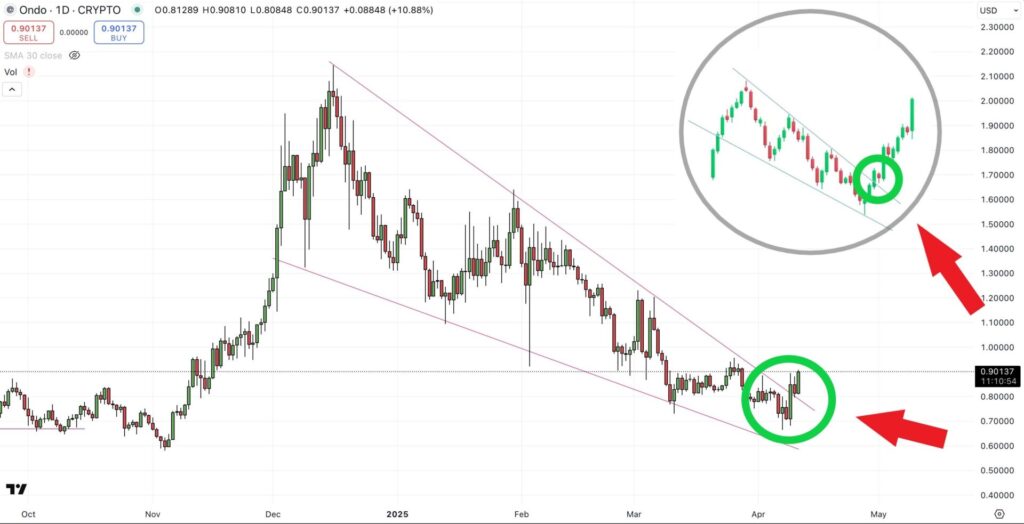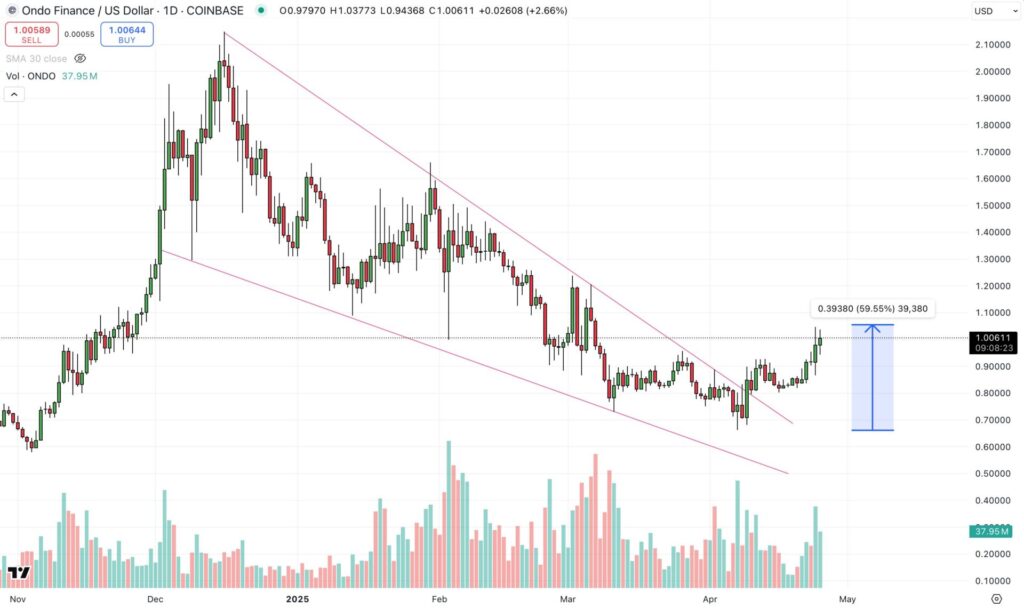 ONDO recently broke the resistance of a falling wedge and surged in volume from lows of $0.73 to recent highs of $1.00 as of late April 2025.