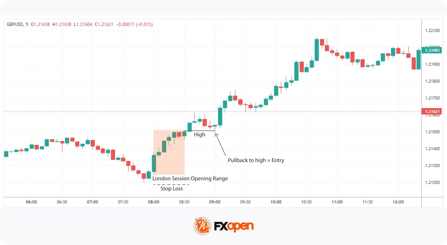 In forex, the Opening Range strategy can also be applied, albeit with some unique considerations. Unlike the stock market, forex operates 24 hours a day, five days a week, with no clearly defined opening or closing times. The ORB strategy applies the same logic to specific forex sessions. The London open breakout strategy and the New York session breakout are the two common session anchors, as both tend to produce directional moves tied to institutional order flow.
