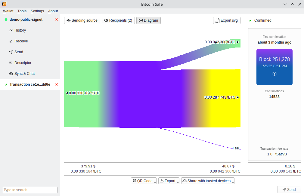 Using the Nostr protocol, Bitcoin-Safe syncs transaction and address labels across devices encrypted end to end. “I created a protocol on top of Nostr to link these computers and synchronize the labels seamlessly,” Griffin noted. Multisig participants can share Partially Signed Bitcoin Transactions (PSBTs) with one click, with relays storing encrypted messages for asynchronous access.
