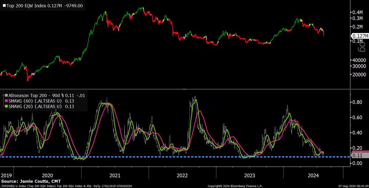 Jamie Coutts, the chief crypto analyst at Real Vision, says that “high quality” altcoins could be approaching a market bottom based on the top 200 equal weight index versus market cap ratio.