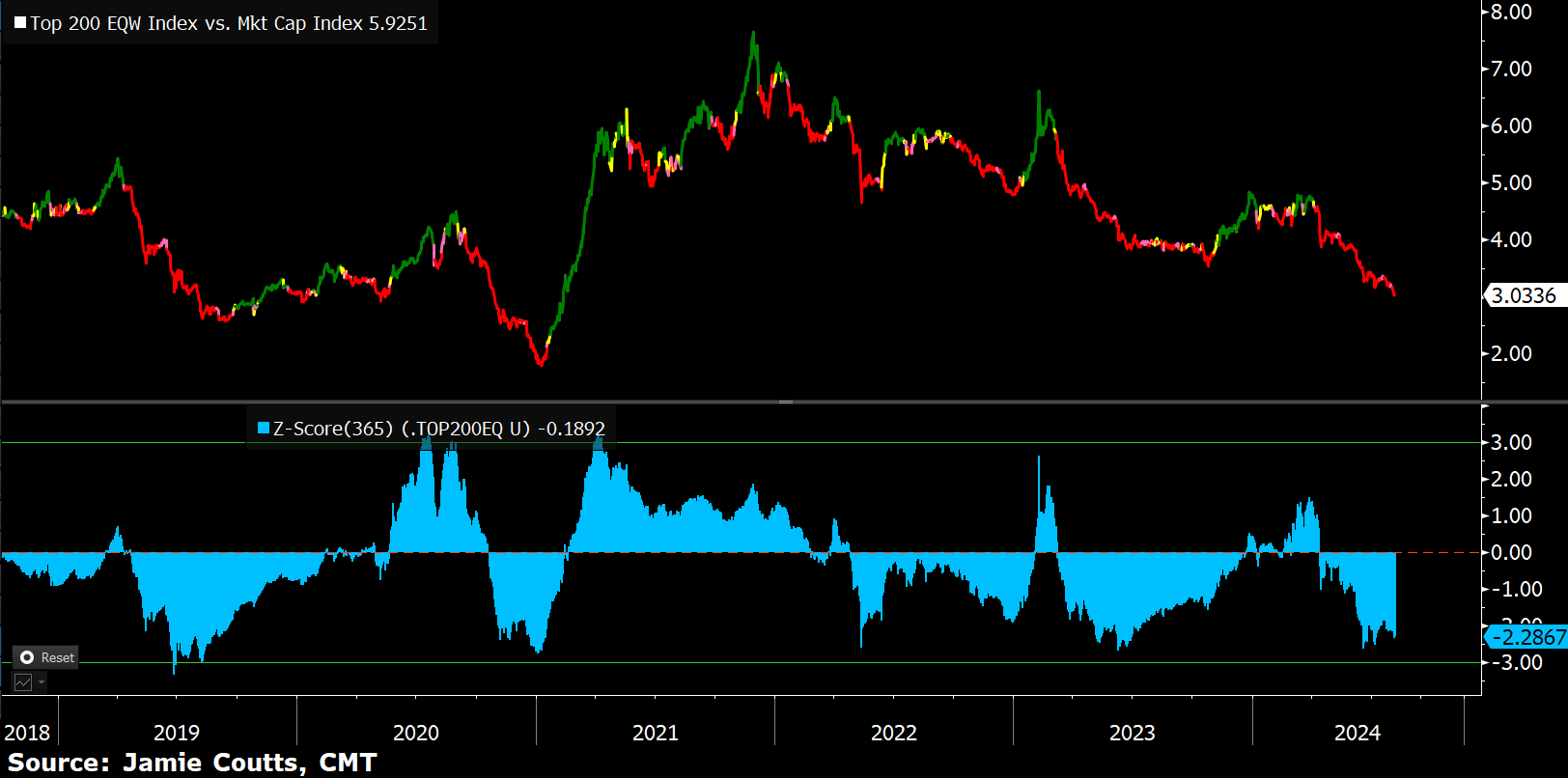 “My small-cap or alt-sentiment chart: the top 200 equal weight index versus market cap ratio chart (top) shows a continuation of the same theme from last month.