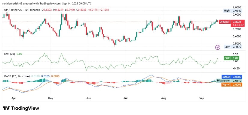 Additionally, Optimism’s technical indicators support a bullish narrative. The Chaikin Money Flow (CMF) stands at 0.09, confirming net inflows into the asset, while the MACD line above its signal points to accelerating upward momentum. Together, these metrics reflect improving sentiment in the short term.