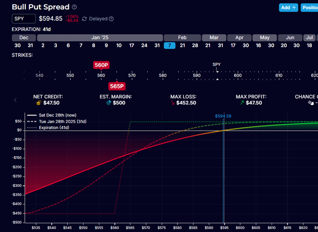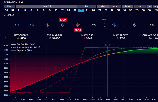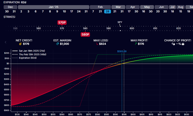 We will keep the same strikes at $580 and $570 but place the spread at a later expiration (such as Feb 28, two weeks later).