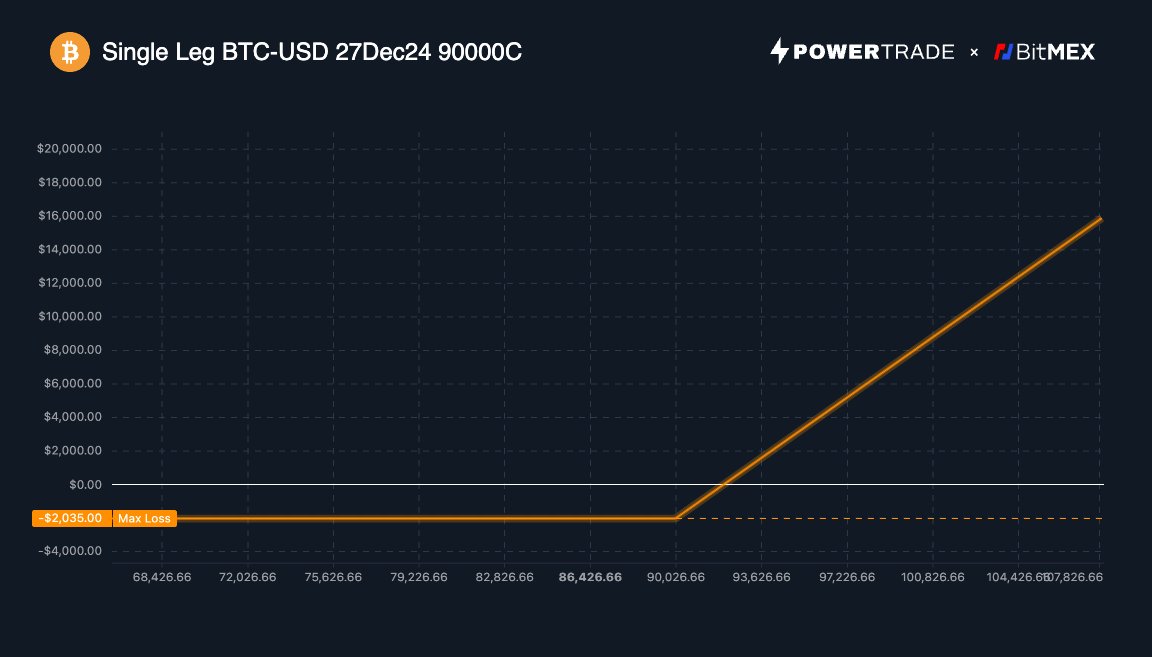 Let’s say Bitcoin is currently trading at $75k. You purchase an OTM call with a strike price of $90k, expiring in December.