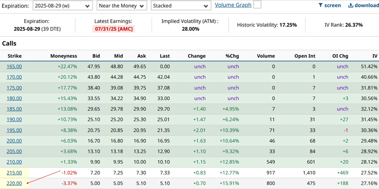 In particular, I’m looking at the call option with the strike price of $220 (the one pointed to by the red arrow). And I’m looking at it on July 21, 2025.