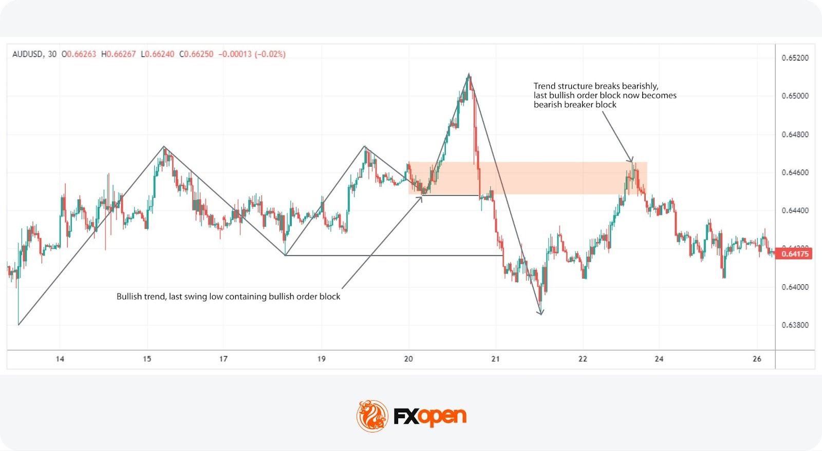 In forex, a breaker block forms when an OB fails and price decisively trades through it, signalling a shift in market structure. There are two types: a bearish and bullish breaker block, both of which use breached zones that act as a reference level on a retracement.