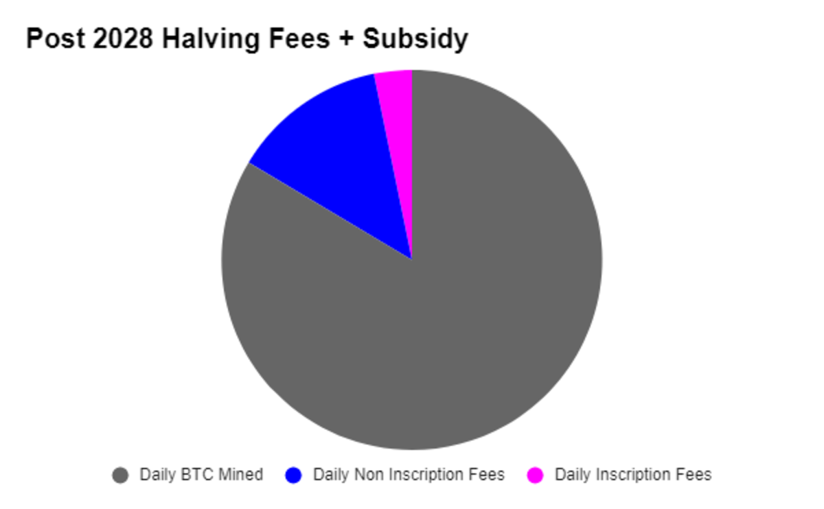 What’s exciting to ponder is what happens to the fees and subsidies leading up to and beyond the 2024 halving. Earlier we saw that if you average daily revenue from transaction fees plus inscription fees, it equals around 4.5% of miners’ daily revenue. But what happens to that post-halving? And what happens if we lived in a vacuum and kept fees flat into the 2028 halving?