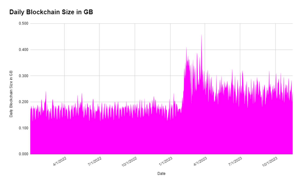 In February, you can see where Ordinals begin to have a significant footprint on blockspace. In the month of January, we saw an average of 0.5 MB of daily inscriptions added to the blockchain, but February through the rest of the year saw an average of 85 MB of inscriptions added per day.