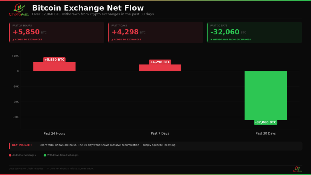 According to a chart tracking Bitcoin Exchange Net Flow posted by analyst Crypto Patel, more than 32,060 BTC have been withdrawn from centralized trading platforms over the past 30 days.